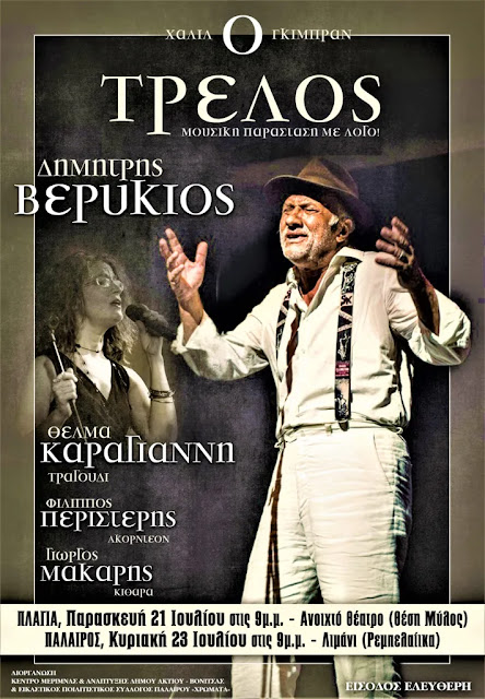 Το Κέντρο Κοινωνικής Μέριμνας και Ανάπτυξης του Δήμου Ακτίου Βόνιτσας στα πλαίσια των φετινών πολιτιστικών εκδηλώσεων «Ταξίδια Πολιτισμού – Καλοκαιρινά Ραντεβού Δήμου Ακτίου Βόνιτσας / ΚΑΛΟΚΑΙΡΙ 2023» διοργανώνει Μουσική Παράσταση με Λόγο με το έργο «Ο ΤΡΕΛΟΣ» του Χαλίλ Γκιμπράν που σκηνοθετεί και αφηγείται ο Πλαγιώτης ηθοποιός Δημήτρης Βερύκιος .