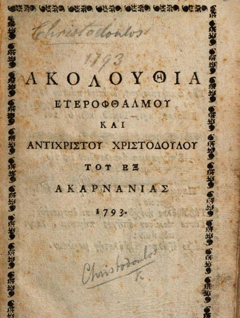 [13] Παναγιώτης Νούτσος, «Χριστόδουλος ο εξ Ακαρνανίας και Encyclopedie: προδρομική ανακοίνωση», Ο Ερανιστής, τ. 17 (1981), σ. 13-24 · Γιάννης Καράς, Γερμανικές…, ό.π., σ. 162.