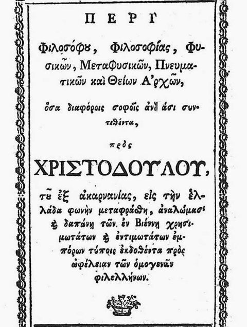Παμπλέκης Χριστόδουλος, Περί φιλοσόφου, φιλοσοφίας, φυσικών, μεταφυσικών, πνευματικών και θείων αρχών, Βιέννη, 1786.